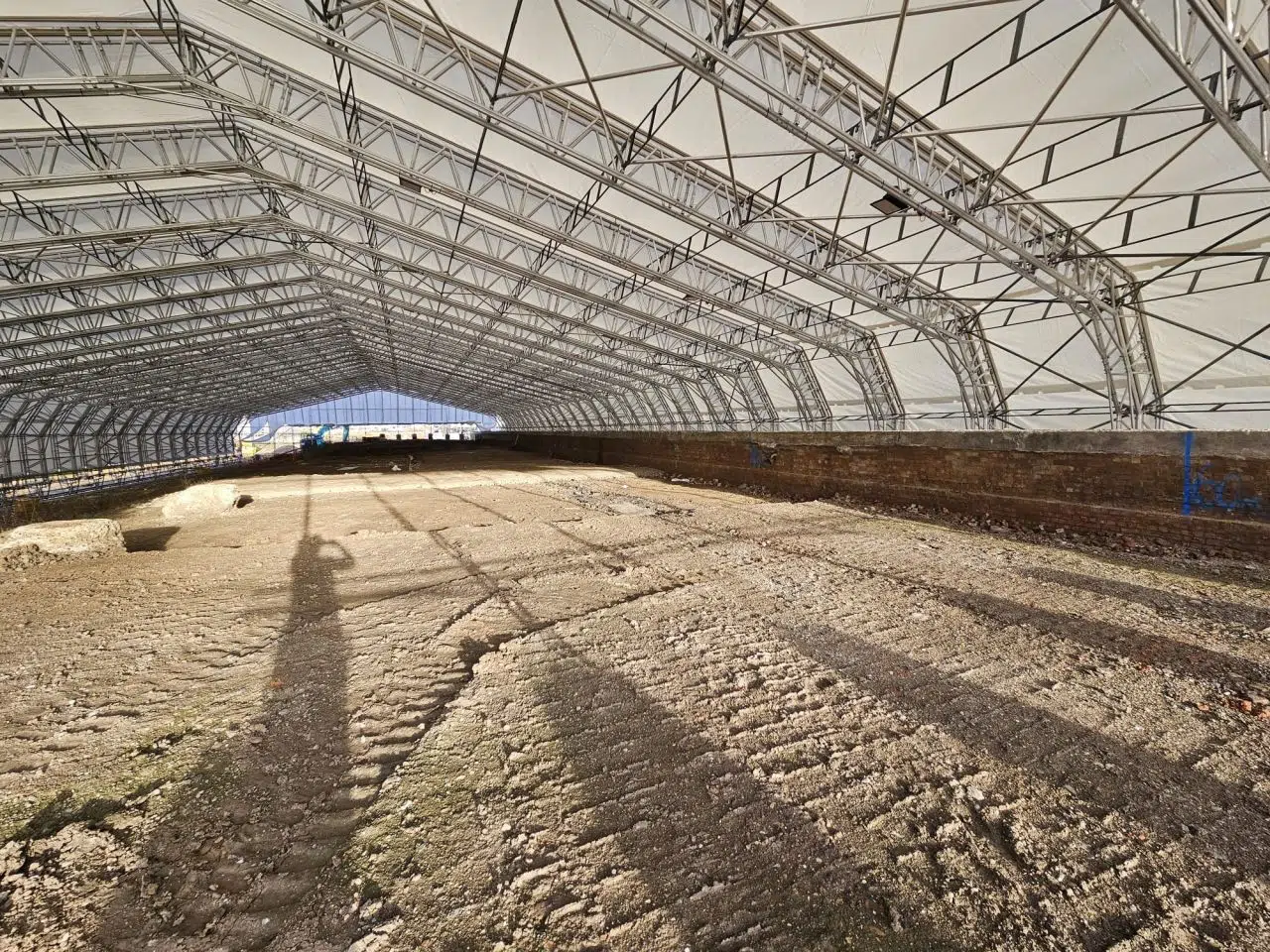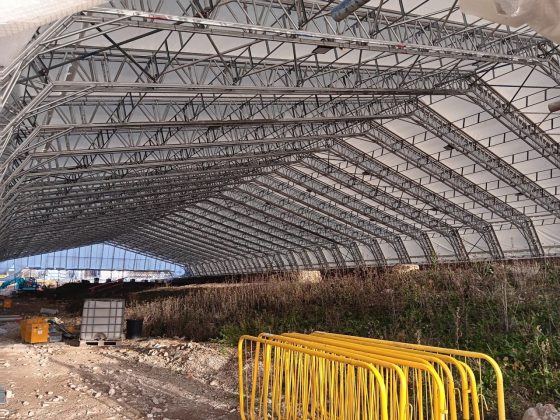 The images will show the scale of the roof, the encapsulation detail and the track system used to relocate the structure as construction advances.