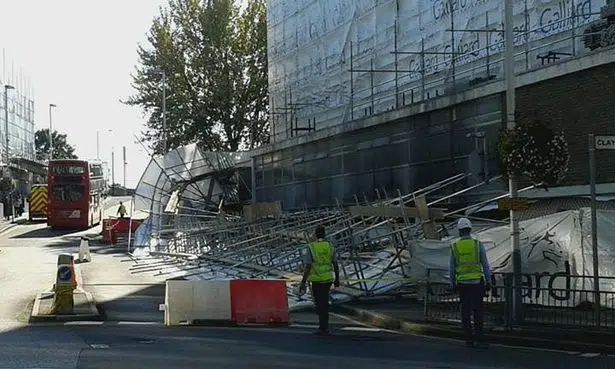 A Metropolitan Police spokesman confirmed the incident happened at 12.53pm.Ā There were no injuries and work is under way to remove the scaffolding from the road.