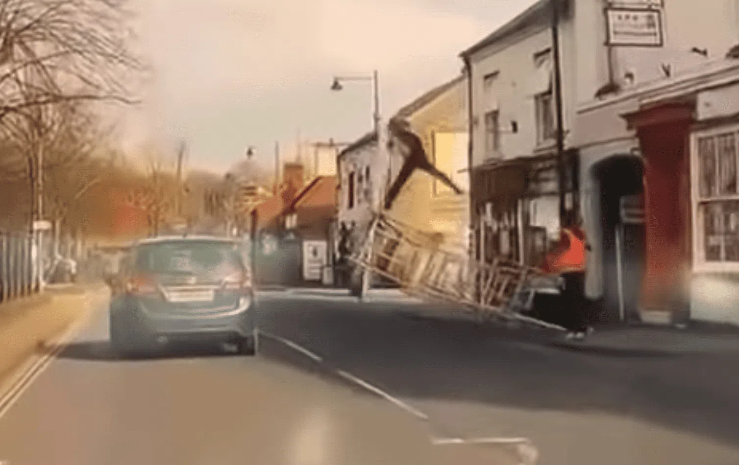 In a startling incident caught on a driver’s dashcam video last week in Buckingham, an aluminium mobile scaffold erected in front of a house on a bustling road collapsed, hurling two men into the path of oncoming traffic.